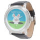 Ein niedlicher Osterhase, der ihm den Kopf kitzelt, hat ein Loch mit dem Text "Happy Oaster" überschwemmt.