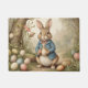 Bei diesem Design handelt es sich um einen Hasen mit weichen Pastellfarben und sanften Details, der eine winzige, gemütliche Weste trägt, eine reizende Wiese mit Blume und einem Korb Ostereier in der Nähe.