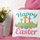 Ein schönes Happy Oaster Kissen mit hübschen Pastellfarben aquamarin und rosa mit einer niedlichen Blumengrenze vor Christlichen Kreuzen. Ein wunderschönes religiöses Osterdesign für eine Kirche oder religiöse Familie.