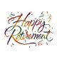 Wasserfarbige Schrift, die "Happy Retirement" in einem skurrilen, kalligrafischen Stil ausdrückt, wobei die Buchstaben durch einen Farbverlauf in Regenbogenfarben von Rot zu Orange, Gelb, Grün, Blau und lila, verstreut Konfetti und Raster in den entsprechenden Farben um die Schrift herum, Set vor einem sauberen, weißen Hintergrund übergehen.