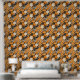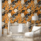 Ein nahtloses Muster mit großen weißen Blume, winzigen weißen Blume, schwarzen Blätter und kleinen schwarzen Musiknoten auf orangefarbenem Hintergrund. Das Design ist handbemalt und verbindet Blumenelemente mit musikalischen Motiven zu einer harmonischen und künstlerischen Komposition.