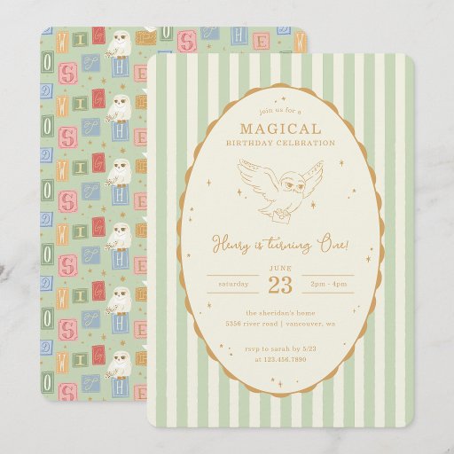 Invite friends and family to a magical celebration with this charming Harry Potter Hedwig birthday design. Featuring Hedwig soaring with a letter in her beak, the artwork is beautifully framed inside a scalloped oval accented with warm golden tones and delicate star details for a timeless Wizarding World touch. Soft green and white vertical stripes create a fresh, classic backdrop that feels both elegant and playful — perfect for boys or girls.