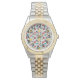 Diese Frauenuhr hat ein modernes Design von einem Gitter aus schwarzen Linien mit Quadraten und Rechtecken in Retrofarben auf einem weißen Feld.
