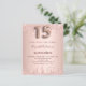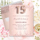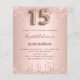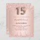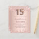 Eine moderne, stilvolle und glamouröse Einladung für eine Girl's Quinceañera, 15. Geburtstagsfeier. Ein Imitat Rose gold metallische Hintergrund mit einem eleganten Imitat Rose Gold Glitzer Tropfen, Farbe Tropfen aussehen. Der Name ist mit einer modernen dunklen Rose goldfarbenen Handschrift geschrieben, die als Stilschrift dient. Personalisieren Sie Ihre Party-Daten und fügen Sie sie hinzu. Nummer 15 wird mit einem Schriftart im Ballonstil geschrieben, Skript.