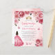 Diese schöne Quinceañera Einladung zeigt eine Grenze von rosa Rosen auf einem rosa Aquarell Hintergrund. Eine goldene Tiara, ein dunkelhaariges Mädchen in einem rosa Prinzessenkleid und kleine rosa Schmetterlinge schmücken den Text. Das Wort "Quinceañera" und der Name des Ehrengast erscheinen in eleganter rosa Handschrift, der Rest in grau sans serif Schriftart.