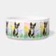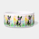 bunte Haustierschüssel mit tragenden Sonnenbrillen coolen Boston-Terriers. Kunst durch Amanda Basham