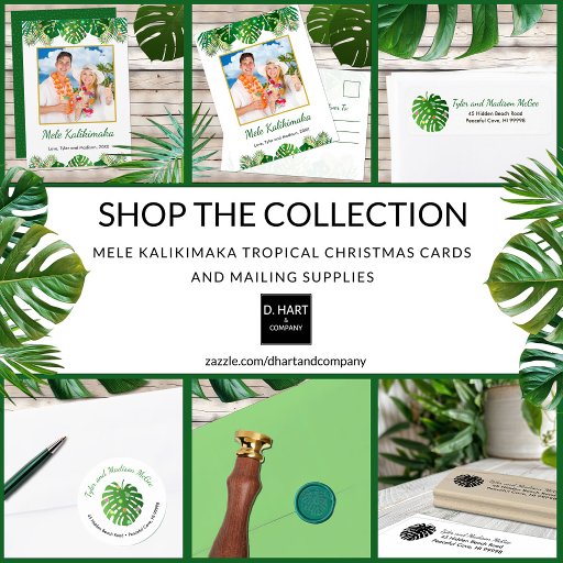 Das moderne Design der Ferienkarte besticht durch üppiges tropisches Strandblättern an der Vorderseite, mit Palmenfronten und monsterischen philodendron-Blätter, die mit leuchtenden bunten Lichtern geschmückt sind. In der Mitte befindet sich ein individualisierbares quadratisches Foto mit goldenem Rand, das durch ein eigenes ersetzt werden kann. Unter dem Foto befinden sich zwei anpassbare Textzeilen, darunter die Begrüßung "Mele Kalikimaka", die hawaiianische Art, frohe Weihnachten zu sagen. Sie können dieses Design mit Ihrem eigenen Gruß, Namen und Jahr oder einem anderen Text Ihrer Wahl personalisieren. Die Rückseite der Karte ist dunkelgrün, mit einem Muster von kleinen festlichen Goldpunkten, die zum Bilderrahmen passen.