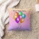 Dieses Kissen hat eine Gruppe von hellen festlichen Ballons in vielen Farben mit passenden Bändern auf einem tripastellfarbenen Hintergrund von gelbem Rosa und lila. Passen Sie Ihren Text mit der Vorlage auf der Vorder- und Rückseite an.