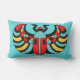 Dieses Kissen aus Stoff im Freien ist aquablau mit einem großen, bunten abstrakten Käfer aus Tuch in den Farben Schwarz, Gelb, Blau und Gelb.