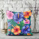 Ein gewagter, maximalistischer tropischer Blumendruck mit großen lila, orangen und rosa Blüten auf dunkelblauem Hintergrund.