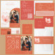 Eine moderne Hochzeitseinladung mit trendigem, hellorangefarbenem Text und Details in Grapefruitrot. Dieser Orangenschatten heißt Verona Sunset. Details in Imitat Gold, eine Silhuette einer zarten Blume. Moderne Typografie und Foto in Bogenform.