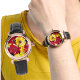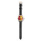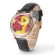 Ein buntes Armgesicht mit farbenfrohen, gelben und roten Gerber-Farbfotos auf schwarzem Hintergrund mit der Vintagen Lederband. Die weißen Zahlen sind eine Vorlage, die Sie entfernen/löschen können. Sie können dieses Design auch dort übertragen, wo es passend zu einem anderen Produkt in der Scroll-Bar passt, wie z.B. der Taschenuhr oder der Wanduhr.