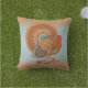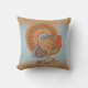 Dieses dekorative Kissen im Outdoor-Gewebe hat einen männlichen Truthahn mit einem geblasenen Schwanz in den Herbstfarben goldbraun und orange stehend in einem Haufen von fallfarbenen Blätter auf einem blauen, zu tieforangen Hintergrund auf der Vorder-und Rückseite.