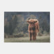 Herbstgras-Foto des Hochlandkalbs. Atemberaubendes junges Kalb von hochschottischen Rindern auf einem Herbstgrasfeld mit gedämpften Farben. Schöner, dunkelhaariger Orangenmantel kontrastiert mit hellgelb grünem Gras und Bäumen im Hintergrund.
