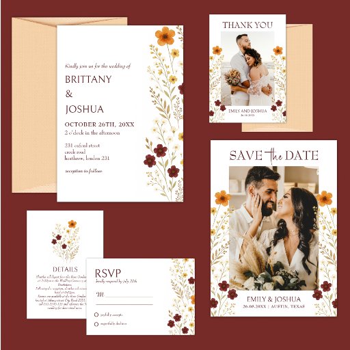 Dieses Design besticht durch Herbsthochzeiten mit eleganten, orangefarbenen und braunen Wildblumen im bohobischen Stil. Personalisieren Sie es mit Ihren Veranstaltungsdetails, um es ganz Ihrer zu machen!