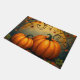 Zwei große Kürbis sitzen auf einer Holzoberfläche. Herbstblätter und verdrehte Zweige umgeben sie und schaffen eine skurrile Herbstszene.