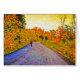 Eine Frau geht eine Straße hinunter, die von Bäumen gesäumt ist, die von Laubbäumen gesäumt sind.