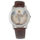 Die klassische Lederuhr dieses Mannes wird mit einem Kunstdruck von Jesus auf dem Uhrengesicht gezeigt und hat braune Lederriemen. Passen Sie diese Uhr an oder kaufen Sie, wie es ist. Lizenziertes Bild