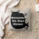 Dieses Zuhause-Mietkissen mit zerrissenem und rissenem Papierdesign in hellgrau mit "Welcome To Our Zuhause", das von unten herausguckt. Die Mitte ist schwarz, der Text ist hellgrau. Text und schwarze Hintergrundfarbe können auf Wunsch leicht angepasst werden.