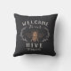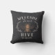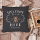 Herzlich willkommen in diesem niedlichen, bienenorientierten Kissen, das eine Vintage Honigbienenabbildungen mit botanischen Blattdetails schmückt. "Willkommen in unserem Bienenstock" erscheint in Elfenbeinbuchstaben. Personalisieren Sie Ihren Familiennamen ganz unten.