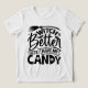 Dieses Halloween-Design enthält den spielerischen Satz "Hexe hat besser Süßes", der in einem dynamischen, gemischten Schriftart-Layout angeordnet ist. Das Wort "Hexe" wird in fett gedruckten, blockigen Buchstaben angezeigt, während "Besser" in einem kursiven, fließenden Skript geschrieben wird, das dem Design ein Gefühl der Dringlichkeit und Spaß verleiht. Die Phrase "Have My" ist in einem Banner eingeschlossen und betont die Nachfrage weiter. Das Wort "Candy" fällt ganz unten in großen Blockbuchstaben auf, mit kleinen Schädelabbildungen, die in das Design integriert sind. Weitere Halloween-Elemente wie ein Hexenbromstock, eine Fledermaus, ein Stern und eingepackte Süßigkeiten sind in der Komposition verstreut, was das gespenstische und festliche Gefühl verstärkt.