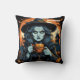 Eine beeindruckende Hexe mit einer leuchtenden Tasse, umgeben von Jack-o'-Laternen und einer unheimlichen Fledermauskulisse und einer Spuk Burg unter Vollmond.