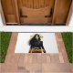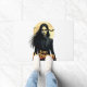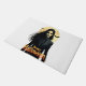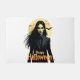 Stilisierte Abbildung einer geheimnisvollen Hexe, die unter einem glühenden Vollmond stehend ist, mit umherfliegenden Fledermäusen und einer spitzigen 'Happy Halloween'-Nachricht.