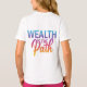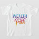Der T - Shirt enthält den Satz "Wohlstand ist der Pfad" in einem lebendigen mehrfarbigen Farbverlauf. Jedes Wort überwindet sich reibungslos in das nächste und schafft so ein dynamisches und auffälliges Design.