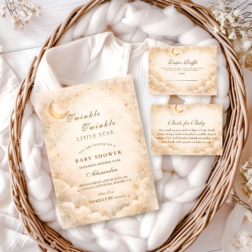 Ein traumhaftes himmlisches Design, inspiriert von sanften Sternenhimmeln und goldenem Mondlicht. Zarte Halbmonde und verstreute Sterne umrahmen einen warmen Elfenbeingrund, während raffinierte Goldtypografie ein elegantes, zeitloses Gefühl erzeugt. Perfekt für eine klassische, geschlechtsneutrale Feier mit einem Hauch von Raffinesse. Ideal für Mamas, die sanfte Neutöne, subtilen Glanz und eine anmutige, märchenhafte Atmosphäre lieben.