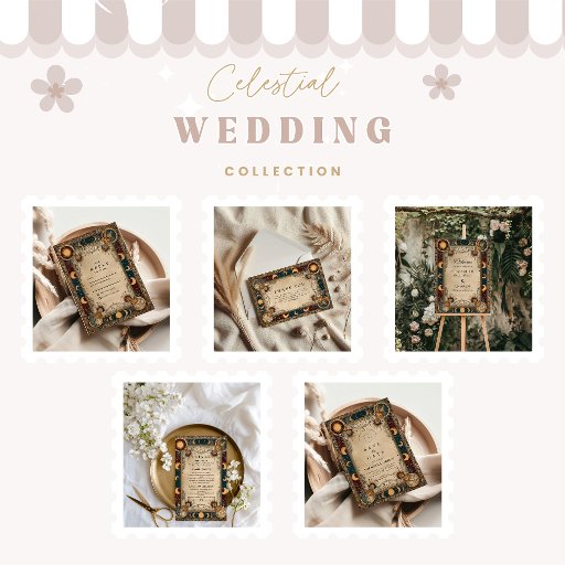 Ein atemberaubendes himmlisches Hochzeitsdesign, inspiriert von königlicher Barockkunst und alter Astronomie. Tiefe Karmesin- und Mitternachtstöne umrahmen leuchtende Sonnen, Monde und Sterne in einer üppigen himmlischen Bordüre und schaffen eine perfekte Balance zwischen Opulenz und Mystik. Ideal für Paare, die vintage kosmische Ästhetik lieben und eine Hochzeitseinladung möchten, die sich sowohl königlich als auch zeitlos anfühlt.