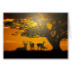 Eine kleine Hirschherde besiedelt sich für die Nacht unter einem riesigen Eichenbaum mit einem strahlenden Sonnenuntergang.
