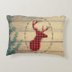 Akzentkissen im rustikalen Stil. Designed mit einem Hirschkopf mit Geweih, aus rot kariert. Ein extravaganter ovaler Rahmen umgibt das Bild. Ein Bild von Holzplanken für den Hintergrund gibt ihm ein Outdoorland-Gefühl.