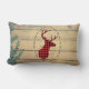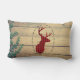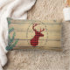 Ein Kissen aus Lendenwirbel im rustikalen Stil. Designed mit einem Hirschkopf mit Geweih, aus rot kariert. Ein extravaganter ovaler Rahmen umgibt das Bild. Ein Bild von Holzplanken mit grünen Efeu-Blätter für den Hintergrund verleiht ihm ein ausgesprochen ländliches Ambiente.