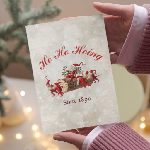 Ho Ho Hoing seit 1890 Weihnachtsgrüße ist ein niedliches und lustiges Vintages Retro-Design mit einigen Weihnachtsgnomen auf einem Holzsteg.