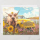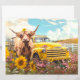 "Meadow Melody" Im Foto steht "Meadow Melody" als ruhige Highland-Kuh vor einem Vintagen, gelben Lieferwagen-LKW. Das lebendige Feld der Sonnenblumen und der malerische weiße Zaun unter dem teilweise bewölkten Himmel schaffen eine malerische Umgebung. Diese reizvolle Szene mit ihrem Storybook-Charme zeigt die schmucke Eleganz der Kuh inmitten einer Feier ländlicher Schönheit. RHDesign erstellt decoupage Papiere für Möbel, Koffer, Leinwand, Plakatkunst und Wohngestaltung.