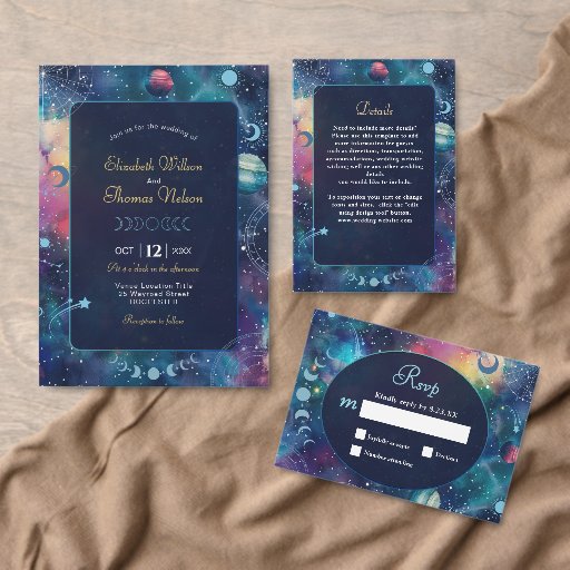 Set den Ton für eine magische Feier mit dieser Celestial Midnight Moon Phases Wedding Invitation, mit einem faszinierenden blauen und aquamarinen Galaxie Hintergrund. Dieses bezaubernde Design unterstreicht die Schönheit des Nachthimmels mit eleganten Mondphasen-Illustrationen, schimmerndem Sternenstaub und himmlischen Akzenten. Ideal für Paare, die zur Astrologie, zum Kosmos oder zu mystischen Themen gezeichnet sind, verbindet die Einladung traumhafte Romantik mit kosmischem Wunder. Mit seiner ausgeklügelten Gestaltung und dem Charme einer anderen Welt ist diese Einladung ideal für eine unvergessliche Hochzeit unter den Sternen.