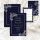 Eine Navy und White Elegant Stil Hochzeit Einladung mit weißem dekorativen Akzent auf einem marinen Hintergrund, vorne und umgekehrt. Der Einladungstext enthält: Die Braut- und Gräuelnamen, Hochzeitstag, Uhrzeit, Ort und Empfang Hinweis. Der umgekehrte Text enthält: UAWG und Ihre UAWG Details. Zum Personalisieren fügen Sie einfach Ihren Text in unsere einfache Vorlage ein und ersetzen das Beispiel. Sehen Sie sich die gesamte Hochzeitskollektion Navy und White Elegant Style für passende Karten und Accessoires an.