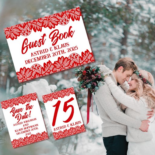 Das traditionelle und moderne norwegische Design erfreut sich in den 1950er Jahren großer Beliebtheit in den Vereinigten Staaten. Rot-norwegische "Spitze" auf verschneiten Weiß, mit einem gemütlichen passenden Schriftart, ist für ein einzigartiges und schönes Hochzeitsdesign.