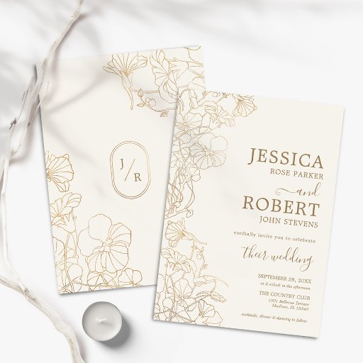 Blumenhochzeit Einladung in Elfenbein-Creme und Imitat Goldfolie. Das Minimalistische boho Design bietet handgezeichnete Kontur-botanische Akzente, Schriftart von Schriftzeichen und Monogramm auf der Kartenrückseite. Gedruckte Zazzle Einladungen oder Sofortdownload digitalen druckbaren Vorlage.