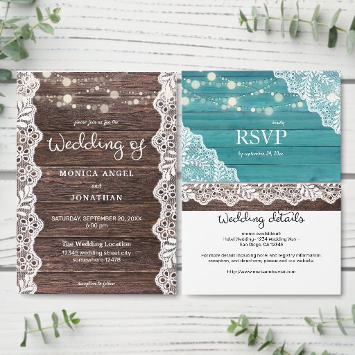 Schicken Sie Ihren Gästen eine schöne Hochzeitseinladung durch dieses Holz & Spitzen mit Saitenlichter Einladung. Ideal für Hochzeiten in Land und Hinterhof.