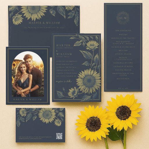 Diese marineblaue Hochzeitseinladung zeigt einen reich detaillierten Rahmen von geätzten Sonnenblumen, der Ihre Hochzeitsdetails in elegantem, goldfarbenem Text umrahmt. Die symmetrische botanische Anordnung verbindet rustikale Wärme mit formaler Eleganz - ideal für Hochzeiten im Garten oder im Spätfrühling. Auf der Rückseite befindet sich ein personalisiertes Sonnenblumenmonogramm mit den Initialen des Paares für eine raffinierte Touch. Bitte beachten Sie: Gold ist eine bedruckte Farbe, nicht metallisch oder Folie.