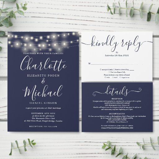 Eine elegante marineblaue Hochzeitskarte mit Informationen und hübschen Saitenleuchten. Personalisieren Sie mit Ihren besonderen Details Set in stilvoller Typografie und Ihre Namen und Hochzeitsdatum auf der Rückseite. Entwickelt von Thisisnotme©