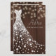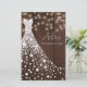 Weiß glänzende Diamanten Hochzeitskleid auf einem dunkelbraunen Stallholz mit bunten Lichterketten, die eine einfache, moderne und elegante Brautparty-Tipp-Karte bilden.