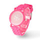 Kinder Watch mit einem rosa Gesicht und einem rosa Glitzer-Gurt mit einem Schneeflockenprint im Urlaub gezeigt. Farbe Rosa Pink Passen Sie diese Uhr an oder kaufen Sie, wie es ist.