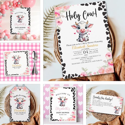 Cute design for your girl's baby shower with a Beautiful Cow Theme in watercolor with Bouquets of Roses and a ribbon with the Phrase "HOLY COW" with beautiful typography in black and a white background, it is ideal to receive that cute little person who is coming on the way!. Personalize this girl's baby shower invitation by adding your own event details, and don't forget to check out the collection for additional elements for your Watercolor Cute Cow Themed baby shower party.