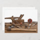 Foto verschiedener Holzwerkzeuge auf einem abgenutzten Holztisch vor weißem Hintergrund