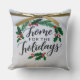 Bring warmth and festive charm to your home with this 'Home for the Holidays' throw pillow. Featuring elegant typography surrounded by holly leaves, red berries, and pine branches, the design captures the joy of gathering with loved ones during the season. A golden ribbon bow adds a touch of sparkle, making this pillow a perfect accent for sofas, chairs, or beds.