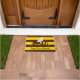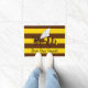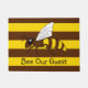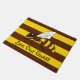 Willkommene Gäste herein mit dieser Honigbienenfußmatte. Eine Cartoonbiene ist gegen einen gelben und braunen Streifenhintergrund. Die Mitteilung liest "Biene unser Gast".