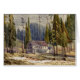 Aquarellmalerei eines dreigeschossigen Hotels und der Außengebäude umkreist durch Rotholz und andere Bäume in Calaveras County, Kalifornien.
