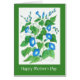 Eine hübsche Blumengrüßkarte mit hellblauen Morning Glory-Blume auf weißem Hintergrund mit einem passenden grünen Rahmen und einer eleganten, weißen Schrift. Das Design ist eine handbemalte Wasserfarbe von Judy Adamson und Sie können die innere Botschaft personalisieren.